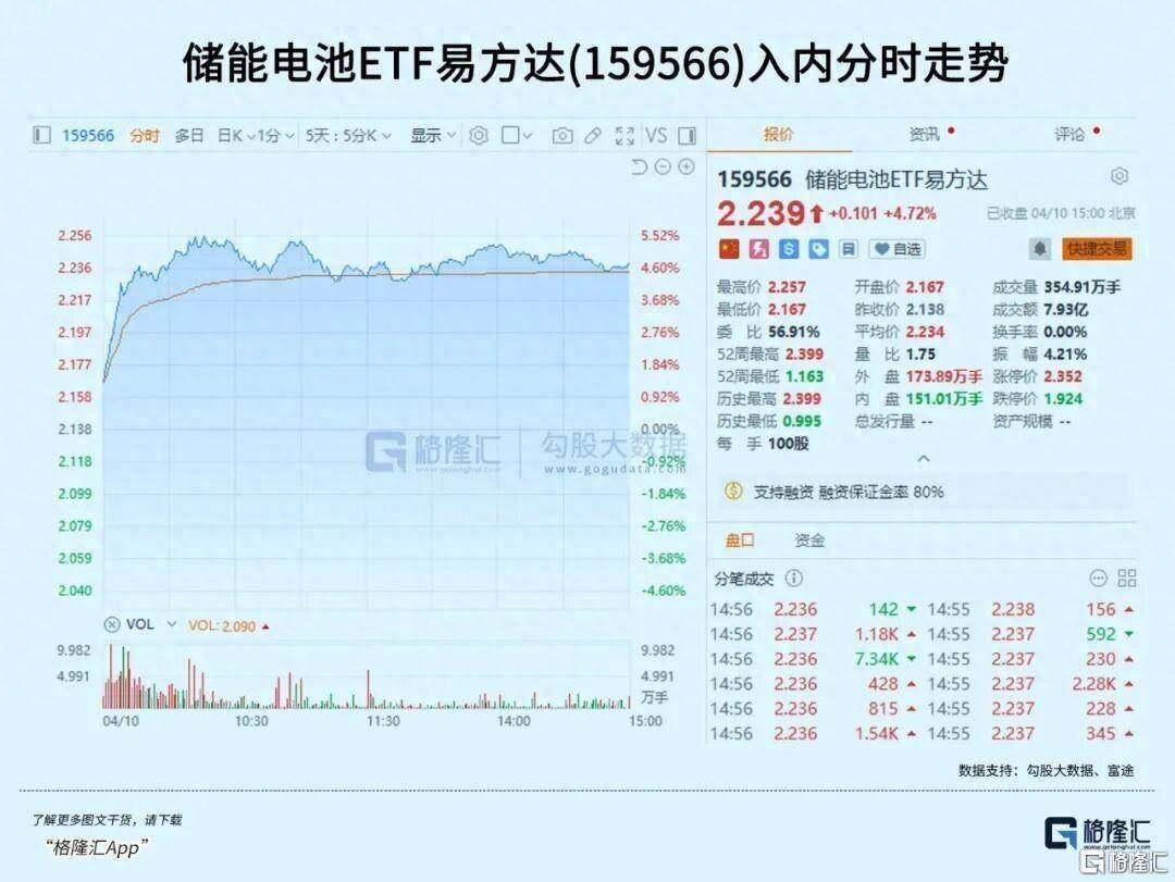 ETF端一样呈现资金涌入态势,电板ETF易方达(159175)大涨4.46%,储能电板ETF易方达(159566)涨超4.72%,近20日资金净流入22.55亿元。